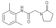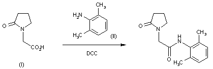 By condensation of 2-(2-oxopyrrolidino)acetic acid (I) with 2,6-dimethylaniline (II) by means of dicyclohexylcarbodiimide (DCC) in refluxing chloroform.