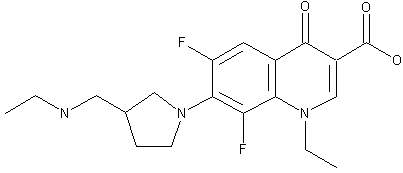 By condensation of 1-ethyl-6,7,8-trifluoro-1,4-dihydro-4-oxoquinoline-3-carboxilic acid (I) with 3-(ethylaminomethyl)pyrrolidone (II) by means of 1,8-diazabicyclo[5.4.0]undec-7-ene (DBU) in acetonitrile.