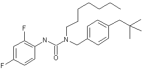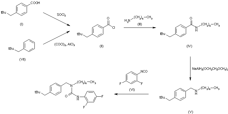 The reaction of 4-neopentylbenzoic acid (I) with SOCl2 in refluxing dichloromethane gives the corresponding acid chloride (II) , which is condensed with heptylamine (III) in dichloromethane to yield 4-neopentyl-N-heptylbenzamide (IV). The reduction of (IV) with di(2-methoxyethoxy)sodium aluminum hydride in refluxing toluene affords 4-neopentyl-N-heptylbenzylamine (V), which is finally condensed with 2,4-difluorophenyl isocyanate (VI) in hexane. Compound (II) can also be obtained from neopentylbenzene (VII) and oxalyl chloride in the presence of aluminum chloride.