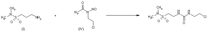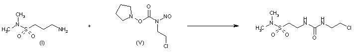 3) By condensation of (I) with 1-[N-(2-chloroethyl)-N-nitrosocarbamoyloxy]pyrrolidine-2,5-dione (V) in methanol with triethylamine as catalyst.