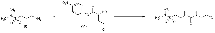1) N,N-Dimethyl-2-aminoethanesulfonamide (I) is condensed with 2-chloroethyl isocyanate (II) by means of triethylamine in CHCl3 giving 1-(2-chloroethyl)- isocyanate (II) by means of triethylamine in CHCl3 giving 1-(2-chloroethyl)-3-[2-(dimethylsulfamoyl)ethyl]urea (III), which is nitrosated with NaNO3, N2O4 or NOCl in acetic acid-acetic anhydride.