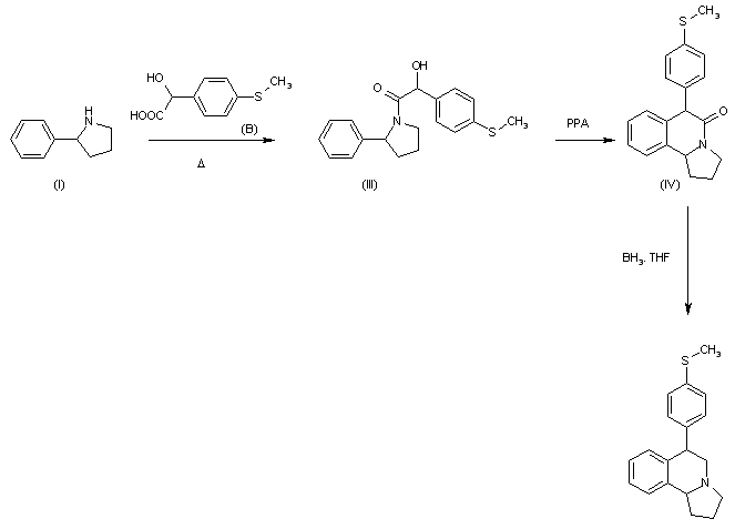 4-(Methylsulfanyl)mandelic acid and 2-phenylpyrrolidine (I) are heated in refluxing xylene with azeotropic removal of water. The resulting mandelamide (III) is cyclized in polyphosphoric acid at 100 C to a mixture of two diastereomeric lactams. The desired isomer, the minor component (ca- 35%), is separated by preparative HPLC and reduced with borane tetrahydrofuran to the final product. The perchlorate salt crystallizes from 2-propanol on treatment of the free base with the requisite amount of 70% perchloric acid.