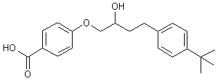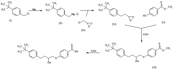 The reaction of 4-tert-butylbenzyl chloride (I) with Mg in ether gives the corresponding Grignard reagent (II), which is condensed with epichlorohydrin (III) yielding 4-(4-tert-butylphenyl)-1,2-epoxybutane (IV). The condensation of (IV) with methyl 4-hydroxybenzoate (V) by means of KOH in refluxing methanol affords 4-[4-(4-tert-butylphenyl)-2-hydroxybutoxy]benzoic acid methyl ester (VI), which is finally saponified with KOH in refluxing ethanol/water.