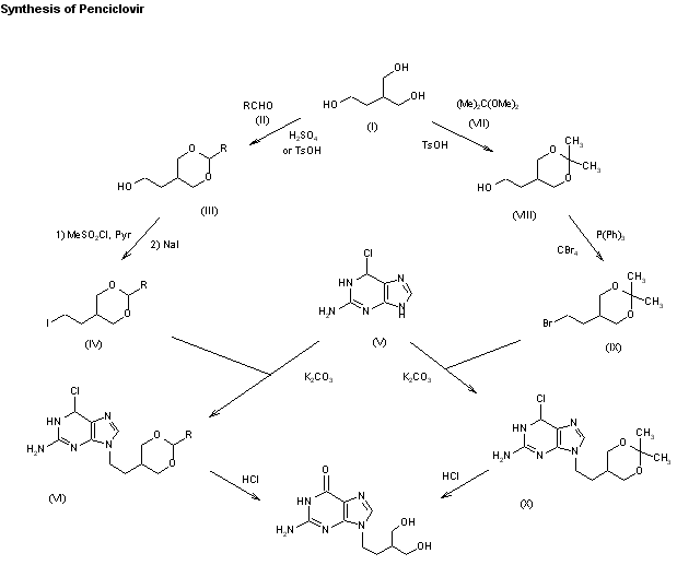 The synthesis of penciclovir by two related ways has been reported: 1) The reaction of 2-(hydroxymethyl)butane-1,4-diol (I) with formaldehyde (or an aldehyde such as trimethylacetaldehyde) (II) by means of H2SO4 (or p-toluenesulfonic acid, TsOH) gives the dioxane (III), which by reaction first with methanesulfonyl chloride and triethylamine and then with NaI in acetone affords the corresponding 5-(2-iodoethyl)-1,3-dioxane (IV). The reaction of (IV) with 2-amino-6-chloropurine (V) by means of K2CO3 in DMF gives the corresponding condensation product (VI), which is finally hydrolyzed and deprotected with refluxing 2M aqueous HCl. 2) The reaction of triol (I) with 2,2-dimethoxypropane (VII) by means of TsOH gives the corresponding 1,3-dioxane (VIII), which by reaction with triphenylphosphine and CBr4 is converted to the 5-(2-bromoethyl) derivative (IX). The reaction of (IX) with the purine (V) by means of K2CO3 as before affords the corresponding condensation product (X), which is hydrolyzed and deprotected with 2M HCl as before.