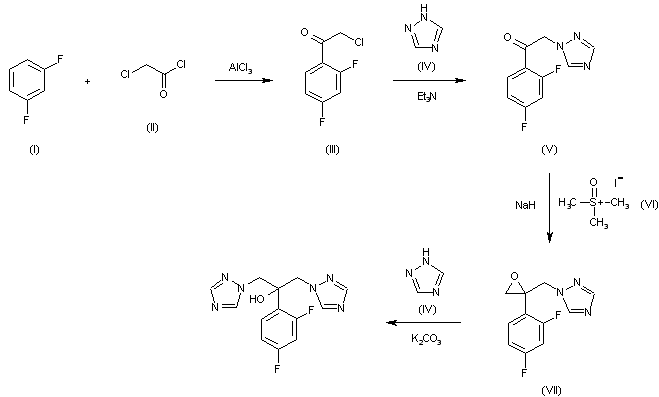 The Friedel-Crafts' condensation of 1,3-difluorobenzene (I) with chloroacetyl chloride (II) by means of AlCl3 yields alpha-chloro-2,4-difluoroacetophenone (III), which is treated with 1,2,4-triazole (IV) and triethylamine in refluxing ethyl acetate giving alpha-(1H-12,4-triazol-1-yl)-2,4-diftuoroacetophenone (V). The reaction of (V) with trimethylsulfoxonium iodide (VI) by means of NaOH in toluene affords 1-[2-(2,4-di fluorophenyl)-2,3-epoxypropyl]-1H-1,2,4-triazole (VII), which is finally treated again with 1,2,4-triazole (IV) and K2CO3 in hot DMF.