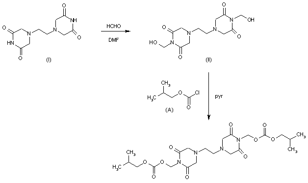 | 合成路线图解说明: 4,4'-Ethane-1,2-diylbis(piperazine-2,6-dione) in DMF is heated at 130 C for 10 min. Aqueous formaldehyde is then gradually added, and the mixture is heated at 130 C for 1.5 h. 4,4'-Ethane-1,2-diylbis[1-(hydroxymethyl)piperazine-2,6-dione] precipitates from the solution on cooling. It can be purified by recrystallization from dioxane. The hydroxymethyl compound (II) is then stirred with pyridine and chloroform at 10 C. Isobutoxycarbonyl chloride is gradually added, and the mixture is stirred for 6 h at room temperature. The resulting solution is diluted with chloroform. The combined solution is washed with water and then dried. Evaporation of the chloroform gives MST-16. It can be purified by recrystallization from ethylene glycol monomethyl ether. |