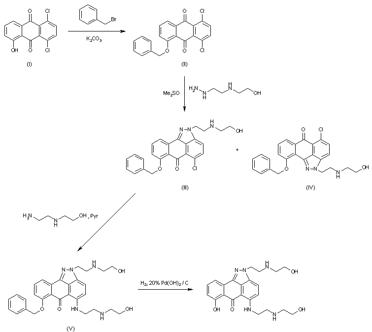 1,4-Dichloro-5-hydroxy-9,10-anthracenedione (I) is alkylated with powdered potassium carbonate and benzyl bromide to give the ether (II). The ether is condensed with threee equivalents of 2-[(2-hydrazinoethyl)amino]ethanol in anhydrous dimethylsulfoxide to give regioisomers (III) and (IV), which are separated by flash silica gel chromatography. The isomer (III) is reacted with an excess of 2-[(2-aminoethyl)amino]ethanol in refluxing pyridine to give the intermediate (V). The intermediate is converted to the 10-hydroxy isomer by hydrogenolysis of the benzyl protecting group with Pearlman's catalyst in glacial acetic acid, followed by dihydrochloride salt formation.