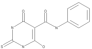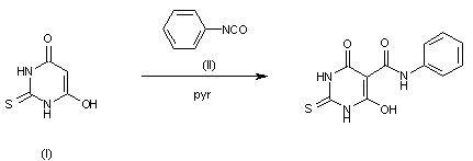 Merbarone can be prepared in 64% yield by stirring a mixture of 2-thiobarbituric acid (I) and phenyl isocyanate (II) for 4 h at 75-85 C in pyridine.