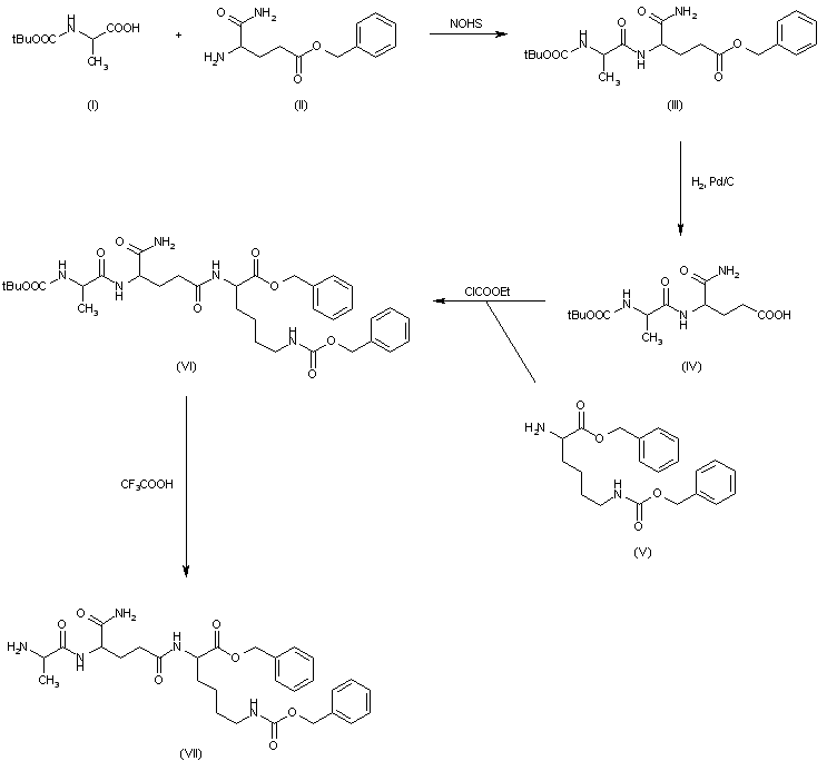 The condensation of tert-butoxycarbonyl-L-alanine (I) with benzyl D-isoglutaminate (II) by means of N-hydroxysuccinimide (NOHS) and dicyclohexylcarbodiimide (DCC) gives the protected dipeptide (III), which is hydrogenated with H2 over Pd/C in methanol yielding tert-butoxycarbonyl-D-isoglutaminyl-L-alanine (IV). The condensation of (IV) with Nepsilon-(benzyloxycarbonyl)-L-lysine benzyl ester (V) by means of ethyl chloroformate and triethylamine affords the protected tripeptide (VI), which is treated with trifluoroacetic acid (TFA) to afford L-alanyl-D-isoglutaminyl-(Nepsilon-benzyloxycarbonyl)-L-lysine benzyl ester (VII).