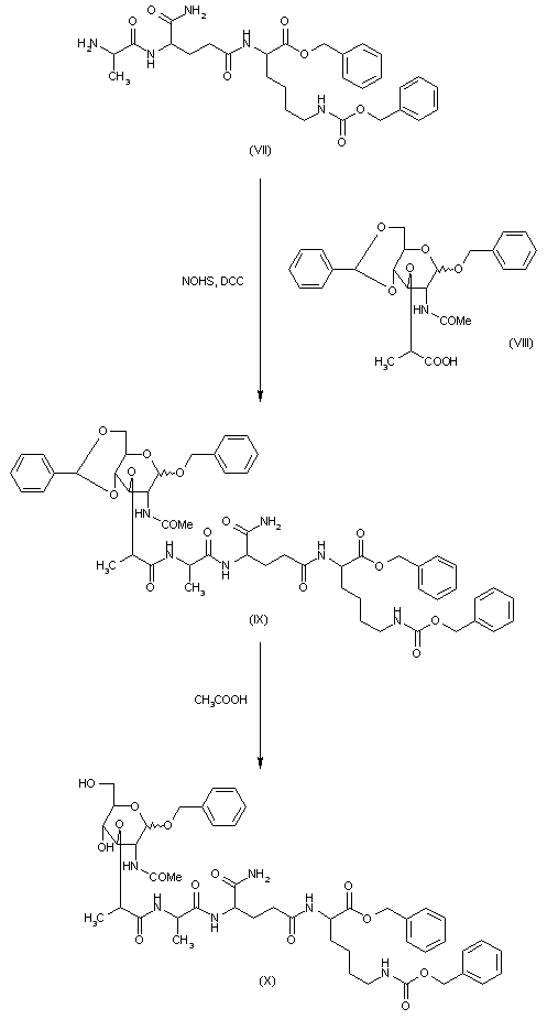 The condensation of (VII) with 1-O-benzyl-4,6-O-benzylidene-N-acetylmuramic acid (VIII) by means of NOHS and DCC as before gives the protected muramyl tripeptide (IX) , which is treated with acetic acid yielding the partially protected compound (X).