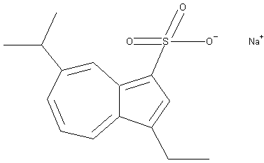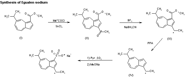 The synthesis of [14C]-labeled KT1-32 has been reported: The acylation of 7-isopropylazulene-1-carboxylic acid ethyl ester (I) with 1-[14C]-acetyl chloride-SnCl4 in dichloromethane gives the corresponding 3-acetyl derivative (II), which is reduced with sodium cyanoborohydride and boron trifluoride in ether to the 3-ethyl derivative (III). The decarboxylation of (III) with polyphosphoric acid at 100 C affords 1-[14C]-ethyl-5-isopropylazulene (IV), which is finally sulfonated with the pyridine-SO3 complex in refluxing benzene.