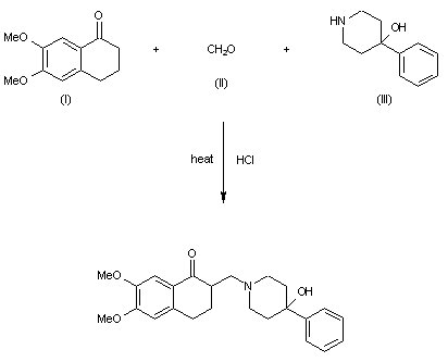 By condensation of 1-tetralone (I) with formaldehyde (II) and 4-phenyl piperidin-4-ol (III) in refluxing ethanol.