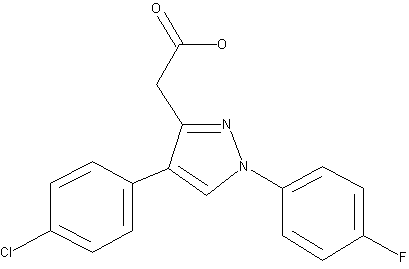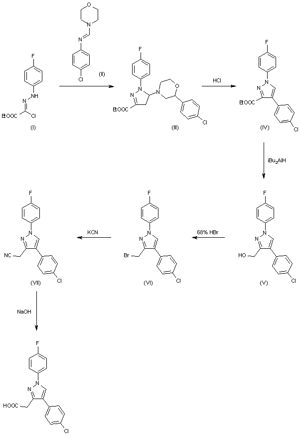 The cyclization of ethyl 2-chloro-2-(4-fluorophenylhydrazono)acetate (I) with 4-(4-chloro-beta-styryl)morpholine (II) by means of triethyiamine in refluxing CHCl3 gives ethyl 4-(4-chlorophenyl)-1-(4-fluorophenyl)-5-morpholino-4,5-dihydropyrazol-3-carboxylate (III), which is treated with HCl in refluxing dioxane yielding ethyl 4-(4-chlorophenyl)-1-(4-fluorophenyl)pyrazol-3-carboxylate (IV). The reduction of (IV) with diisobutylaluminum hydride in toluene affords [4-(4-chlorophenyl)-1-(4-fluorophenyl)-3-pyrazolyl]methanol (V), which by treatment with aqueous 63% HBr at 90 C is converted to 3-(bromomethyl)-4-(4-chlorophenyl)-1-(4-fluorophenyl)pyrazole (VI). The reaction of (VI) with KCN and 18-crown-6 in hot acetonitrile affords 4-(4-chlorophenyl)-1-(4-fluorophenyl)pyrazole-3-acetonitrile (VII), which is finally hydrolyzed with NaOH in water-DMSO at 120 C.