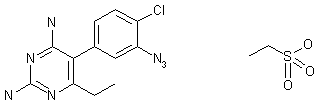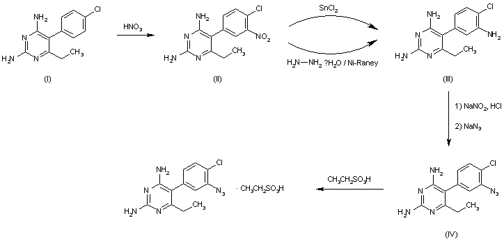 The nitration of 2,4-diamino-5-(4 chlorophenyl)-6-ethypyrimidine(pyrimethamine) (I) with HNO3 in H2SO4 gives 2,4-diamino-4-(4-chloro-3 nitrophenyl)- 6-ethylpyrimidine (II), which is reduced with SnCl2 in 10 N HCl or with hydrazine hydrate - Raney Nickel in 95% ethanol at 65 C to afford 2,4-diamino-5-(3-amino-4-chlorophenyl)-6-ethylpyrimidine (III). The diazotation of (III) with NaNO2 - HCl and treatment of the diazonium salt with sodium azide yields 2,4-diamino-5-(3-azido-4-chlorophenyl)-6-ethylpyrimidine (IV), which is treated finally with ethylsulfonic acid (V).