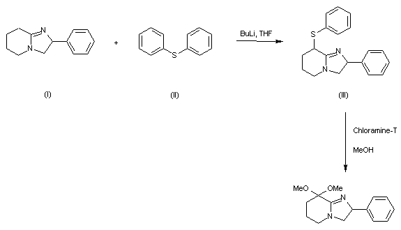The reaction of 2-phenyl-2,3,5,6,7,8-hexahydro imidazo[1,2-a]pyridine (I) with diphenyl sulfide (II) by means of n-butyllithium in THF gives 2-phenyl-8-(phenylthio)-2,3,5,6,7,8-hexahydroimidazo[1,2-a]pyridine (III), which is then oxidized with chloramine T in methanol and simultaneously ketalized.