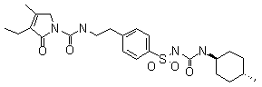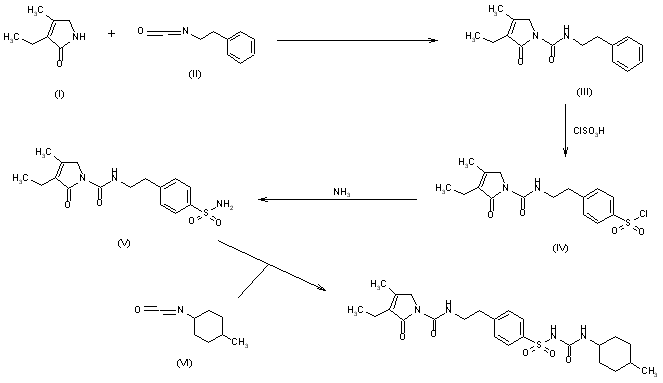 The condensation of 3-ethyl-4-methyl-3-pyrrolin-2-one (I) with 2-phenylethyl isocyanate (II) at 150 C gives 3-ethyl-4-methyl-2-oxo-N-(2-phenylethyl)-3-pyrrolin-1-carboxamide (III), which is sulfonated with chlorosulfonic acid at 40 C to yield the corresponding benzenesulfonyl chloride (IV). The reaction of (IV) with concentrated NH4OH affords the sulfonamide (V), which is finally condensed with 4-methylcyclohexyl isocyanate (VI) in acetone.