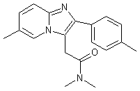 4-Methyl-2'-bromoacetophenone (I) is condensed with 2-amino-5-methyl pyridine (II) to give 2-(4-methylphenyl)-6-methylimidazo[1,2-a]pyridine (III). Compound (III) is condensed with formaldehyde and dimethylamine in a Mannich reaction to give the 3-dimethyl aminomethyl derivative (IV), which is quaternized on the side chain nitrogen to afford the quaternary iodide (V). Displacement of trimethylamine from the quaternary salt (V) with cyanide ion leads to 2-(4-methylphenyl)-6-methylimidazo[1,2-a]pyridine-3-acetonitrile (VI). Acid hydrolysis of the nitrile then affords the corresponding acid (VII). Conversion of the acid to its acid chloride followed by condensation with dimethylamine then leads to zolpidem free base, which is converted to its L-(+)- tartrate (2:1) by treatment with L-(+)-tartaric acid.