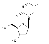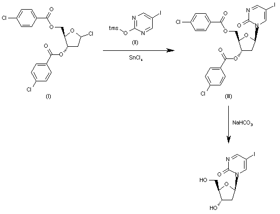 The condensation of 2-(trimethylsilyloxy)-5-iodopyrimidine (II) with the protected sugar chloride (I) by means of SnCl4 in 1,2-dichloroethane gives the pyrimidinone (II), which is finally deprotected by means of NaHCO3 in methylene chloride/water and isolated from a minor amount of the alpha-isomer by crystallization from ethyl acetate.
