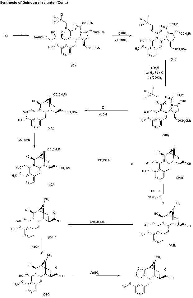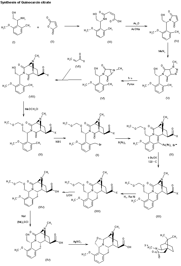 An asymmetric synthesis of (-)-quinocarcin has been described: The acylation of 2-(2-methoxy-6-methylphenyl)-(R)- glycinol (I) with maleic anhydride (II) in ether gives the maleic monoamide (III), which is cyclized to the pyrrolidinedione (IV) by refluxing with acetic anhydride. The cyclization of (IV) with methyl azide in toluene affords the pyrrolotriazole (V), which is irradiated with UV light (Hg lamp), giving the aziridinopyrrole (VI). The cycloaddition of (VI) with the chiral acrylamide (VII) affords the diazabicyclo[3.2.1]octane (VIII). At this point, the hydroxyl group of (VIII) is protected with methoxymethyl chloride giving the methoxymethyl ether (IX), which is submitted to benzylic bromination with N-bromosuccinimide (NBS) in chloroform, yielding the bromo derivative (X). The reaction of (X) with triphenylphosphine affords the phosphonium salt (XI), which by treatment with potassium tert-butoxide and heat cyclizes to the tetracyclo compound (XII). Hydrogenation of (XII) with H2 over RaNi in ethanol affords the reduced compound (XIII), which is treated with LiOH in THF - water, affording the free acid derivative (XIV). The deprotection of the ether group of (XIV) with trimethylsilyl chloride and NaI in acetonitrile gives the hydroxymethyl derivative (XV), which is finally cyclized to (-)-quinocarcin with AgNO3 in methanol-water.