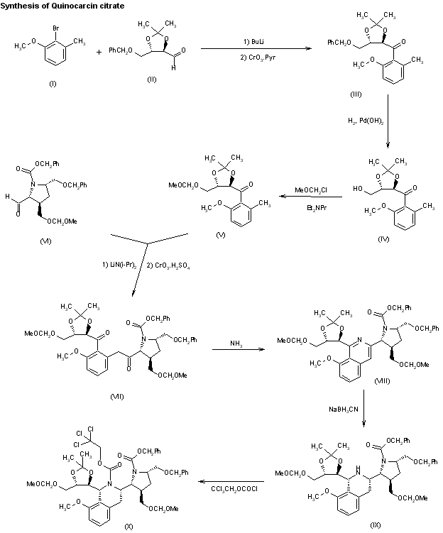 A new total synthesis of (-)-quinocarcin has been reported: The condensation of 2-bromo-3-methylanisole (I) with 4-O-benzyl-2,3-O-isopropylidene-D-threose (II) by means of butyllithium in ether followed by oxidation with CrO3-pyridine gives the ketone (III), which is debenzylated by hydrogenation over Pd(OH)2 to yield the ketol (IV). The protection of the hydroxy group of (IV) with methoxymethyl chloride affords the fully protected ketone (V), which is condensed with suitable optically active pyrrolidine (VI) by means of lithium diisopropylamide, followed by oxidation with CrO3-H2SO4 to give the diketone (VII). The cyclization of (VII) with ammonia in THF yields the isoquinoline (VIII), which is reduced with sodium cyanoborohydride to the tetrahydro derivative (IX). The protection of the imino group of (IX) with 2,2,2-trichloroethyl chloroformate yields the trichloroethyl ester (X).