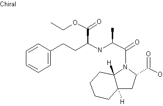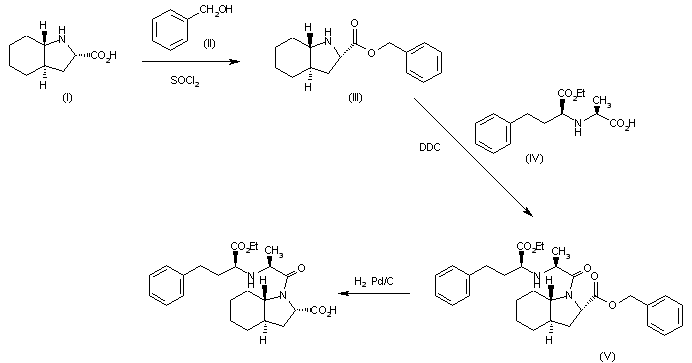 The esterification of (3aR,7aS)-octahydroindole-2(S)-carboxylic acid (I) with benzyl alcohol (II) by means of SOCl2 gives the corresponding benzyl ester (III), which is condensed with N-[1(S)-(ethoxycarbonyl)-3-phenylpropyl]-(S)-alanine (IV) by means of 1-hydroxybenzotriazole, N-ethylmorpholine and dicyclohexylcarbodiimide (DCC) in DMF giving the benzyl ester (V) of the desired product. Finally, this compound is debenzylated by hydrogenation with H2 over Pd/C in ethanol.