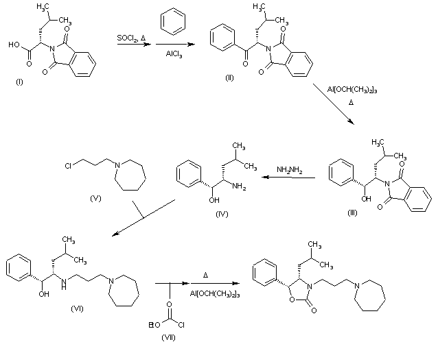Protected aminopentanoic acid derivative (I) is converted into phenylpentanone (II) by first treatment with thionyl chloride in refluxing benzene, followed by condensation with benzene and aluminum chloride. Reduction of (II) with aluminum isopropoxide in refluxing isopropanol provides phenylpentanol derivative (III), which is then treated with hydrazine hydrate in refluxing EtOH to furnish 2-amino-4-methyl-1-phenylpentane-1-ol (IV). Coupling of (IV) with chloro derivative (V) at 110-120 C yields derivative (VI), which is finally converted into the desired oxazolidinone by reaction with ethyl chlorocarbonate (VII) in chloroform followed by heating in toluene and treatment with aluminum isopropoxide.