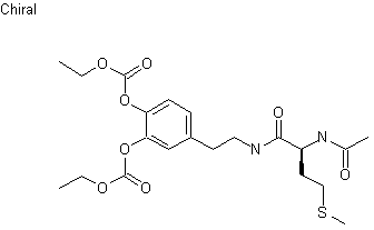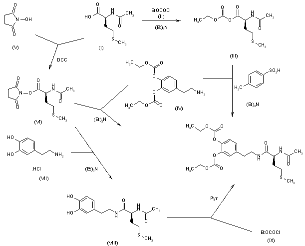 This compound can be obtained in three similar ways: 1) The reaction of N-acetyl-L-methionine (I) with ethyl chloroformate (II) and triethylamine in chloroform gives the corresponding mixed anhydride (III), which is then condensed with 3,4-di(ethoxycarbonyloxy)phenethylamine tosylate (IV) by means of triethylamine in chloroform. 2) The reaction of N-acetyl-L-methionine (I) with N-hydroxysuccinimide (V) by means of dicyclohexylcarbodiimide (DDC) in dioxane gives the corresponding active ester (VI), which is then condensed with the amine (IV) as before. The active ester method can also be carried out in this case using N-hydroxyphthalimide, 1-hydroxybenzothiazole or 4-nitrophenol instead of N-hydroxysuccinimide (V). 3) The reaction of the active ester (VI) with dopamine (VII) by means of triethylamine in DMF gives the corresponding amide (VIII), which is then acylated with ethyl chloroformate (IX) in pyridine.