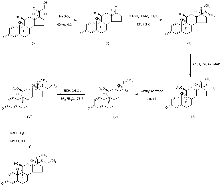 Oxidation of commercially available 9-fluoroprednisolone (I) with sodium bismuthate gives the ketone (II), which is reacted with methanethiol in a mixture of dichloromethane and acetic acid in the presence of boron trifluoride etherate to give the thioketal (III). Acetylation of (III) with acetic anhydride in pyridine containing 4-dimethylaminopyridine gives the acetate (IV), which is heated in diethylbenzene to give the vinyl sulfide (V). The addition of ethanethiol to (V) at low temperatures in the presence of boron trifluoride etherate or trifluoroacetic acid in dichloromethane proceeds with high stereoselectivity to give the thioketal (VI), which is deacetylated with sodium hydroxide in methanol to give tipredane.