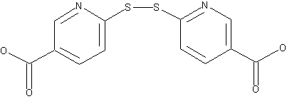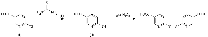 6-Chloronicotinic acid (I) is reacted with thiourea (II) to give 6-mercaptonicotinic acid (III) This is oxidized to the disulfide with iodine or hydrogen peroxide.