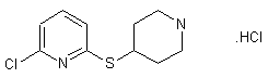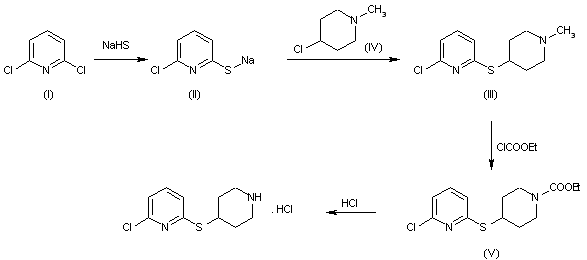 2,6-Dichloropyridine (I) reacts with sodium hydrogen sulfide yielding 6-chloro-2-mercaptopyridine sodium salt (II). The thioether (III) is formed through reaction of 4-chloro-N-methylpiperidine with (II). Cleavage of the N-methyl group is achieved by condensation of (III) with ethyl chloroformate followed by acidic hydrolysis.