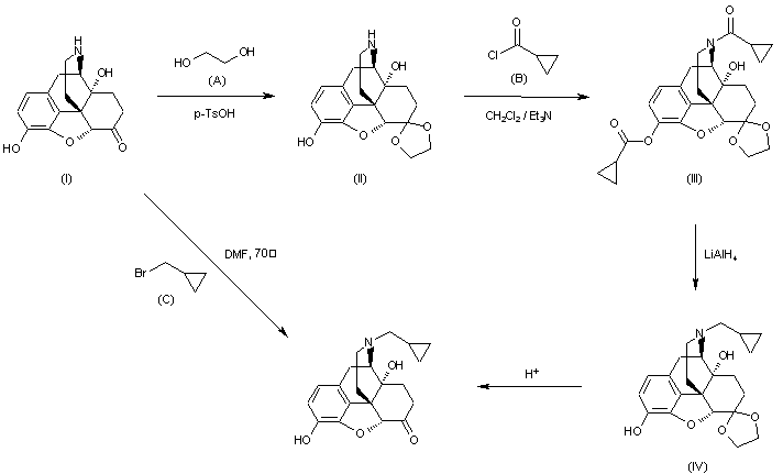 Compound can be prepared in two different ways both starting from 14-hydroxydihydronormorphinone (I): 1) By reaction of (I) with cyclopropylmethyl bromide (C) in DMF at 70 C. 2) Product (I) is ketalized with ethylene glycol (A) by means of p-toluenesulfonic acid giving the cyclic ketal (II), m.p. 311-3 C; this in turn, is treated with cyclopropyl carbonyl chloride (B) in a mixture of methylene chloride and triethylamine yielding the N,O-dicyclopropylcarbonyl derivative (III), mp 219-20 C. Compound (III) is reduced with LiAlH4, in refluxing THF yielding the ethylene ketal of naltrexone (IV), m.p. 221-2 C, which is finally hydrolyzed with aqueous HCl at 100 C.