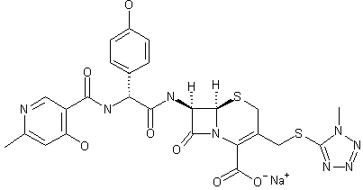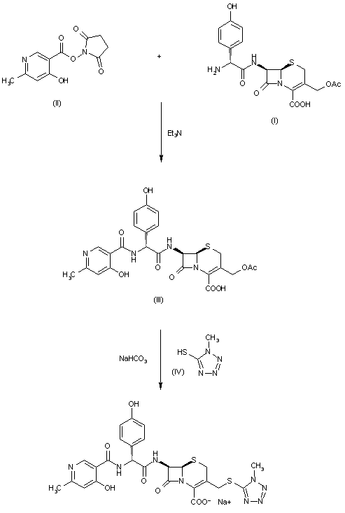The condensation of 7-[alpha-amino-alpha-(4-hydroxyphenyl)acetamido]cephalosporanic acid (I) with 4-hydroxy-6-methylpyridine-3-carboxylic acid N-hydroxysuccinimide ester (II) by means of triethylamine and sodium 2-ethylhexanoate in DMF chloromethaneethyl ether gives 7-[alpha-(4-hydroxy-6-methylpyridin-3-carboxamido)-alpha-(4-hydroxyphenyl)acetamido]cephalosporanic acid (III), which is then treated with 1-methyl-5-mercaptotetrazol (IV) and NaHCO3 in a phosphate buffer.