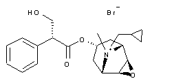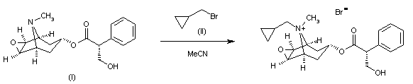 By quaternization of scopolamine base (I) with cyclopropylmethyl bromide (II) in refluxing acetonitrile.