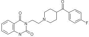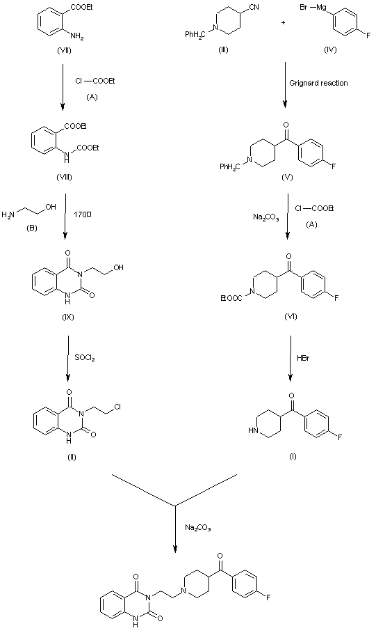 By reaction of 4-(p-fluorobenzoyl)piperidine (I) with 3-(2-chloroethyl)-2,4-(1H,3H)-quinazolinedione (II) by means of Na2CO3 in refluxing 4-methyl-2-pentanone. The starting compounds are prepared as follows: 1) The Grignard reaction of N-benzyl-4-cyanopiperidine (III) with p-fluorophenylmagnesium bromide (IV) ethyl ether gives N-benzyl-4-p-fluorobenzoyl)piperidine (V), which by reaction with Na2CO3 and ethyl chloroformate (A) is converted into N-ethoxycarbonyl-4-(p-fluorobenzoyl)piperidine (VI). Finally, this compound is hydrolyzed with 48% HBr to give (I). 2) The reaction of ethyl anthranilate (VII) with ethyl chloroformate (A) in refluxing xylene gives ethyl 2-(ethoxycarbonylamino)benzoate (VIII), which is cyclized with 2-aminoethanol (B) at 170 C to afford 3-(2-hydroxyethyl)-2,4-(1H,3H)-quinazolinedione (IX). Finally, this compound is treated with SOCl2 in refluxing chloroform to afford (II).