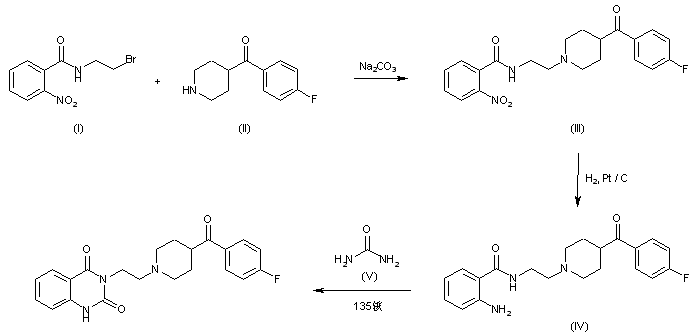 The condensation of N-(2-bromoethyl)-2-nitrobenzamide (I) with 4-(4-fluorobenzoyl)piperidine (II) by means of Na2CO3 in refluxing methyl isobutyl ketone gives N-[2-[4-(4-fluorobenzoyl)-2-piperidinyl]ethyl]-2-nitrobenzamide (III), which is reduced with H2 over Pt/C in methanol yielding the corresponding amino derivative (IV). Finally, this compound is cyclized with urea (V) in refluxing xylene.