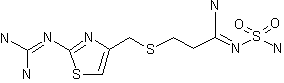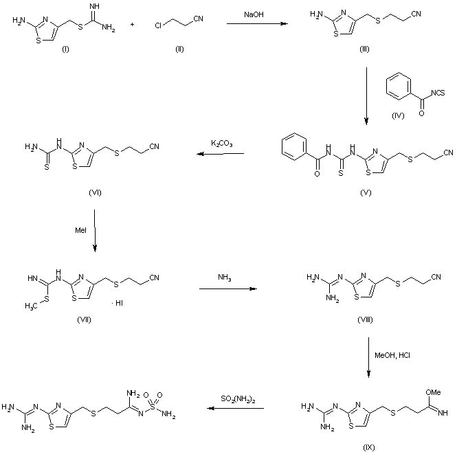 The reaction ot S-(2-aminothiazol-4-ylmethyl)isothiourea (I) with 3-chloropropionitrile (II) by means of NaOH in ethanol - water gives 3-(2-aminothiazol-4-ylmethylthio)propionitrile (III), which is condensed with benzoyl isothiocyanate (IV) in refluxing acetone to afford 3-[2-(3-benzoylthioureido)thiazol-4-ylmethylthio]propionitrile (V). The hydrolysis of (V) with K2CO3 in acetone - methanol - water yields 3-(2-thioureidothiazonl-4-ylmethylthio)propionitrile (VI), which by methylation with methyl iodide in refluxing ethanol is converted into 3-[2-(S-methylisothioureido)thiazol-4-ylmethylthio]propionitrile hydroiodide (VII). The reaction of (VII) with NH3 and NH4Cl in methanol at 90 C in a pressure vessel affords 3-(2-guanidinothiazol-4-ylmethylthio)propionitrile (VIII), which by partial alcoholysis with methanol by means of dry HCl in CHCl3 is converted into methyl 3-(2-guanidinothiazol-4-ylmethylthio)propionimidate (IX). Finally, this compound is treated with sulfamide in refluxing methanol.