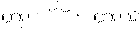 By condensation of N-(2-methyl-3-phenylallyl) hydrazine (I) with pyruvic acid (II) acetate-buffered aqueous medium.