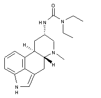 Hofmann rearrangement of isolysergic acid amide (I) using lead tetraacetate produced isocyanate (II), which was further condensed with diethylamine to furnish urea (III). Hydrogenation of N-(D-6-methyl-8-isoergolenyl)-N',N'-diethylurea (III) in the presence of Raney nickel yielded a mixture of the desired isoergoline-I-yl urea along with minor amounts of its isoergoline-II-yl epimer (IV), which were separated by column chromatography. A more stereoselective hydrogenation of (III) was achieved under Birch reduction conditions using lithium amide/aniline to deprotonate the labile urea side chain. Similarly, isolysergic acid amide (I) underwent stereoselective Birch reduction to the 9,10-dihydro derivative (V), which was converted to the title compound via lead tetraacetate-promoted Hofmann rearrangement, followed by coupling with diethylamine.
