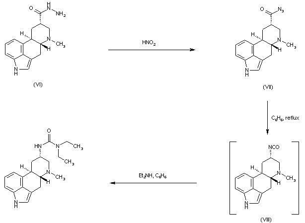 Alternatively, D-dihydrolysergic acid-I-hydrazide (VI) was treated with nitrous acid to produce the corresponding acyl azide (VII), which was further subjected to a Curtius rearrangement in refluxing benzene. Without isolation, the obtained isocyanate (VIII) solution was treated with diethylamine to afford the title urea derivative.