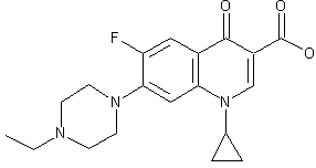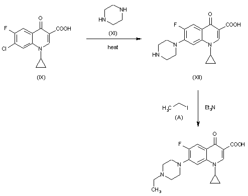 2) The condensation of quinoline (IX) with piperazine (XI) by heating at 140 C as before gives 1-cyclopropyl-6-fluoro-7-(1-piperazinyl)-4-oxo-1,4-dihydroquinoline-3-3-carboxylic acid (XII), which is finally treated with ethyl iodide and triethylamine in hot DMF.