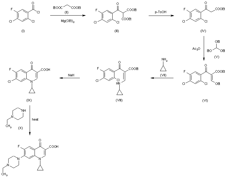 1) The condensation of 2,4-dichloro-5-fluoro-benzoyl chloride (I) with diethyl malonate (II) by means of magnesium ethoxide gives diethyl 2,4-dichloro-5-fluorobenzoylmalonate (III), which is partially decarboxylated with p-toluenesulfonic acid yielding ethyl 2,4-dichloro-5-fluorobenzoylacetate (IV). The condensation of (IV) with triethyl orthoformate (V) by means of refluxing acetic anhydride affords ethyl 2-(2,4-dichloro-5-fluorobenzoyl)-3-ethoxyacrylate (VI), which is treated with cyclopropylamine (VII) in ethanol giving ethyl 2-(2,4-dichloro-5-fluorobenzoyl)-3-(cyclopropylamino)acrylate (VII). The cyclization of (VII) by means of NaH in refluxing dioxane yields 1-cyclopropyl-7-chloro-6-fluoro-4-oxo-1,4-dihydroquinoline-3-carboxylic acid (IX), which is finally condensed with N-ethylpiperazine (X) by heating at 140 C in DMSO.