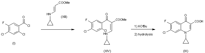 3) The condensation of 2,4-dichloro-5-fluorobenzoyl chloride (I) with methyl 3-(cyclopropylamino)acrylate (XIII) gives methyl 2-(2,4-dichloro-5-fluoro-benzoyl)-3-(cyclopropylamino)acrylate (XIV), which is first cyclized with t-BuOK and then hydrolyzed to give compound (IX).