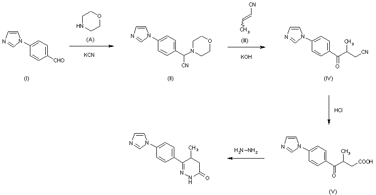 The reaction of 4-(1H-imidazol-1-yl)benzaldehyde (I) with morpholine (A) and KCN in dioxane water by means of p-toluenesulfonic acid gives [4-(1H-imidazol-1-yl)phenyl](4morpholinyl)acetonitrile (II), which is condensed with crotononitrile (III) by means of KOH in methanol yielding 4-[4-(1H-imidazol-1-yl)phenyl]-3-methyl-4-oxobutyronitrile (IV). The hydrolysis of (IV) with hot aqueous HCl affords 4-[4-(1H-imidazol-1-yl)phenyl]-3-methyl-4-oxobutanoic acid (V), which is finally cyclized with hydrazine in refluxing ethanol.