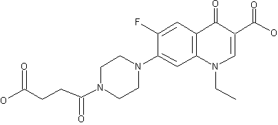 By acylation of 1-ethyl-6-fluoro-4-oxo-7-piperazine-1,4-dihydroquinoline-3-carboxylic acid (I) with succinic anhydride (II) in refluxing dichloromethane. Acetic acid can also be used as solvent in the acylation.