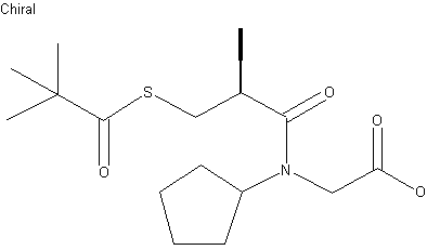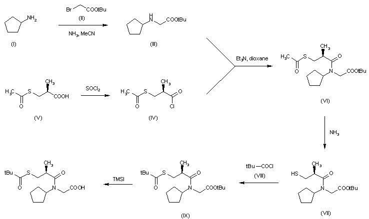 The reaction of cyclopentylamine (I) with tertbutyl bromoacetate (II) by means of NH3 in acetonitrile gives N-cyclopentylglycine tert-butyl ester (III), which is condensed with 3-(acetylthio)-2-methylpropionyl chloride (IV) [prepared from the corresponding acid (V) with SOCl2] by means of triethylamine in dioxane to yield the acylated glycine (VI). Deacetylation of (VI) with dry ammonia in methanol affords the mercapto derivative (VII), which is acylated with pivaloyl chloride (VIII) in the usual way giving the corresponding thio ester (IX). Finally, this compound is hydrolyzed partially with trimethylsilyl iodide in methylene chloride.