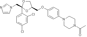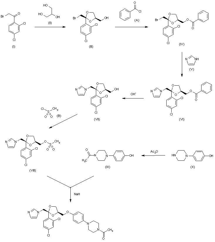 The cyclization of 2,4-dichlorophenacyl bromide (I) with glycerol (II) gives cis-2-(2,4-dichlorophenyl)-2-bromomethyl-4-hydroxymethyl-1,3-dioxolane (III), which is then benzoylated with benzoyl chloride (A) yielding cis-2-(2,4-dichlorophenyl)-2-bromomethyl-4-benzoyloxymethyl-1,3-dioxolane (IV). The condensation of (IV) with 1H-imidazole (V) affords cis-2-(2,4-dichlorophenyl)-2-(1H-imidazol-1-ylmethyl)-4-benzoyloxymethyl-1,3-dioxolane (VI), which is then debenzoylated in basic medium giving cis-2-(2,4-dichlorophenyl)-2-(1H-imidazol-1-ylmethyl)-4-hydroxymethyl-1,3-dioxolane (VII). The reaction of (VII) with methanesulfonyl chloride (B) yields cis-2-(2,4-dichlorophenyl)-2-(1H-imidazol-1-ylmethyl)-1,3-dioxolan-4-ylmethyl methanesulfonate (VIII). Finally, this compound is condensed with 1-acetyl-4-(4-hydroxyphenyl)piperazine (IX) by means of NaH in benzene - DMSO. Compound (IX) is obtained by reaction of 4-(1-piperazinyl)phenol dihydrobromide (X) with acetic anhydride by means of K2CO3 in refluxing acetic acid.