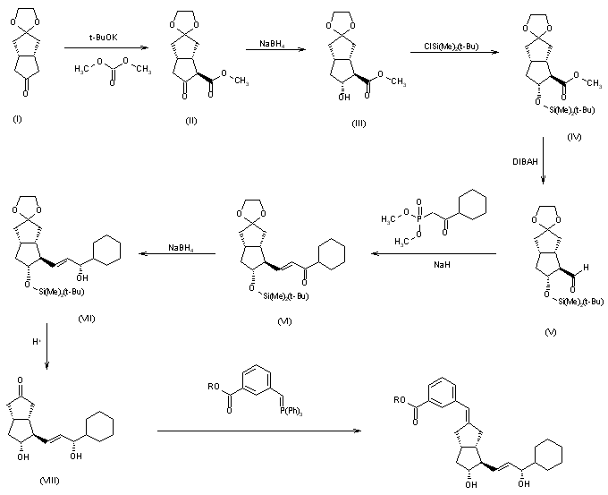 Monoketal (I) is acylated with dimethylcarbonate to (II), reduced with NaBH4 to give (III) and protected with tert-butyldimethylsilylchloride to give (IV). After selective reduction of the ester function of (IV) with DIBAH, the resulting aldehyde (V) undergoes a Wittig-Horner-reaction with dimethyl 2-oxo-2-cyclohexylethylphosphonate to give (VI), which is subsequently reduced with NaBH4. After separation of the epimeric alcohols by silica flash chromatography, (VII) is deprotected with a AcOH/THF/water mixture. Wittig reaction of 3-methoxycarbonylphenylmethylene-triphenylphosphorane with (VIII) gives a mixture of E/Z-isomers, which is separated by preparative HPLC. Ester hydrolysis with KOH and acidification of the E-isomer gives naxaprostene (IX), R = H.