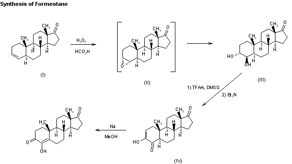 A novel synthetic strategy for the preparation of formestane has been published: The oxidation of 5alpha-3-androsten-17-one (I) with H2O2 in formic acid gives the epoxide (II), which, without isolation, yields 3alpha,4beta-dihydroxy-5alpha-androstan-17-one (III). The reaction of (III) with DMSO and trifluoroacetic anhydride (TFAA), and then with triethylamine affords 3-hydroxy-5alpha-2-androstene-4,17-dione (IV), which is finally submitted to basic isomerization catalyzed by sodium methoxide