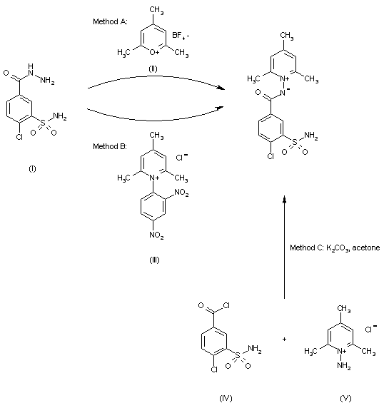 1-[(4-Chloro-3-sulfamoylbenzoyl)amino]-2,4,6-trimethylpyridinium salt is obtained in several ways from 4-chloro-3-sulfamoylbenzoyl hydrazide (I) or from 4-chloro-3-sulfamoylbenzoyl chloride (IV). The pyridinium salt thus produced may be converted by means of a base to besulpamide (I). 1) The first stage of the sequence is accomplished by refluxing the hydrazide (I) in ethanol with the pyrilium salt (II). 2) The Zincke salt (III) from 2,4,6-trimethylpyridine and 2,4-dinitrochlorobenzene is heated with the hydrazide (I) and triethylamine in ethanol. 3) 1-Amino-2,4,6-trimethylpyridinium salt (V) is acylated with 4-chloro-3-sulfamoylbenzoyl chloride (IV) and potassium carbonate in acetone.