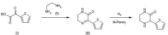 The cyclization of ethyl 2-(2-thienyl)glyoxylate (I) with ethylenediamine (II) in refluxing ethanol gives 3-(2-thienyl)-1,2,5,6-tetrahydropyrazin-2-one (III), which is reduced with H2 over Raney Nickel (RaNi) in hot ethanol at 50 bar.